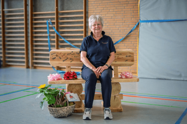 Wie gewohnt betrat sie die Halle, bereit, das nächste Training zu starten. Doch noch bevor sie richtig loslegen konnte, war es vorbei mit der Routine und es wurde auf einmal richtig feierlich. Eine Gruppe aufgeregter Kinder führte die sichtlich überraschte Hauptdarstellerin zu einem besonderen Geschenk, das Trainer, Kolleginnen, Eltern und Turnerinnen heimlich vorbereitet hatten: eine rustikale Gartenbank, liebevoll mit den Unterschriften “ihrer” Mädchen versehen. Ein Zeichen der Dankbarkeit zu ihrem 80. Geburtstag.